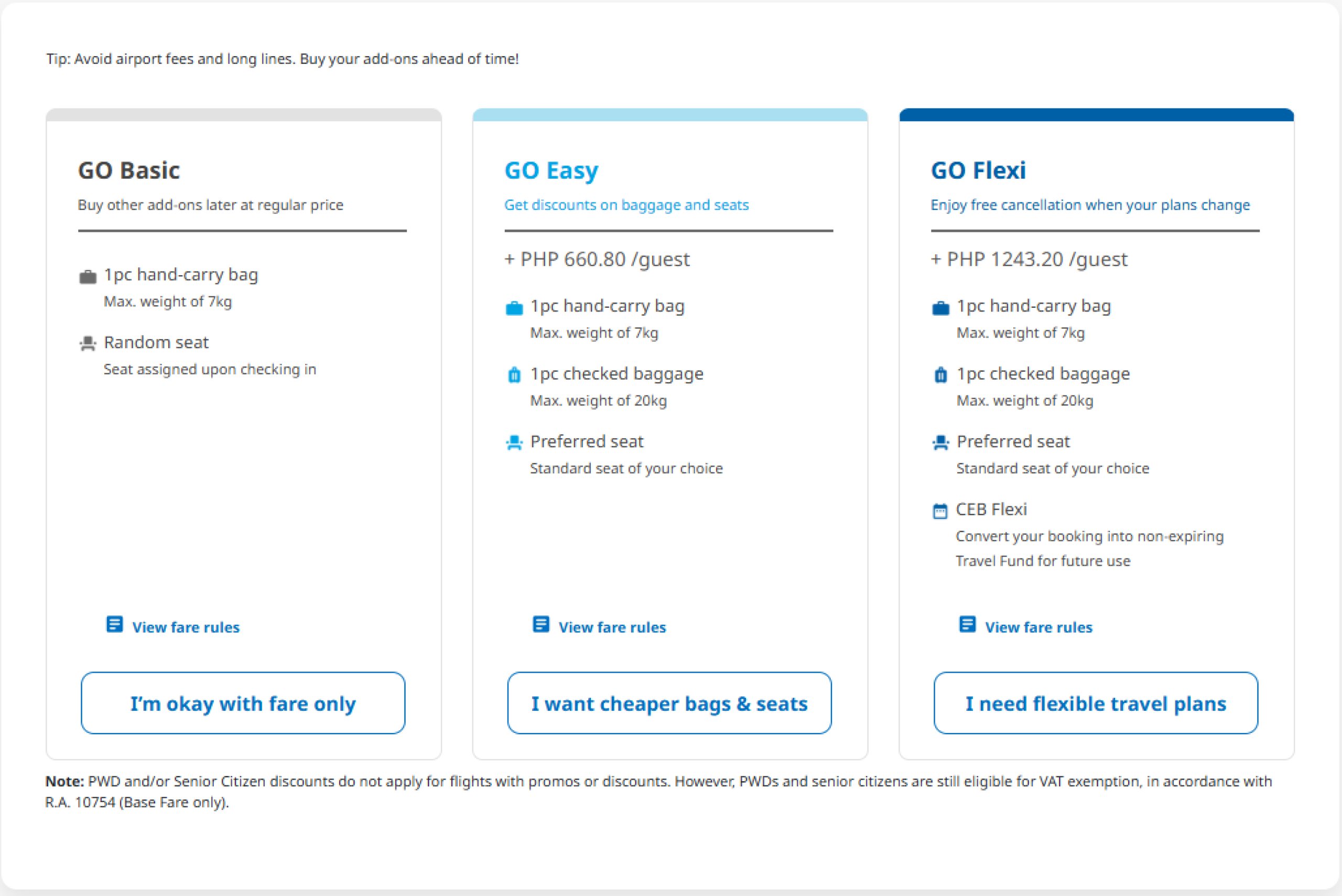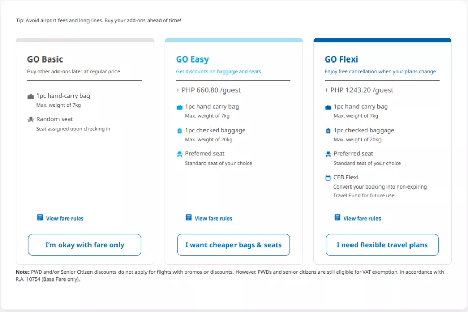 - GO Flexi - Nemokamas registruotas bagažas (20 kg) ir rankinis bagažas, nemokamas sėdimos vietos pasirinkimas, nemokamas atšaukimas (pinigai bus grąžinti kaip kreditas, kurį ateityje galėsite naudoti su "Cebu Pacific".