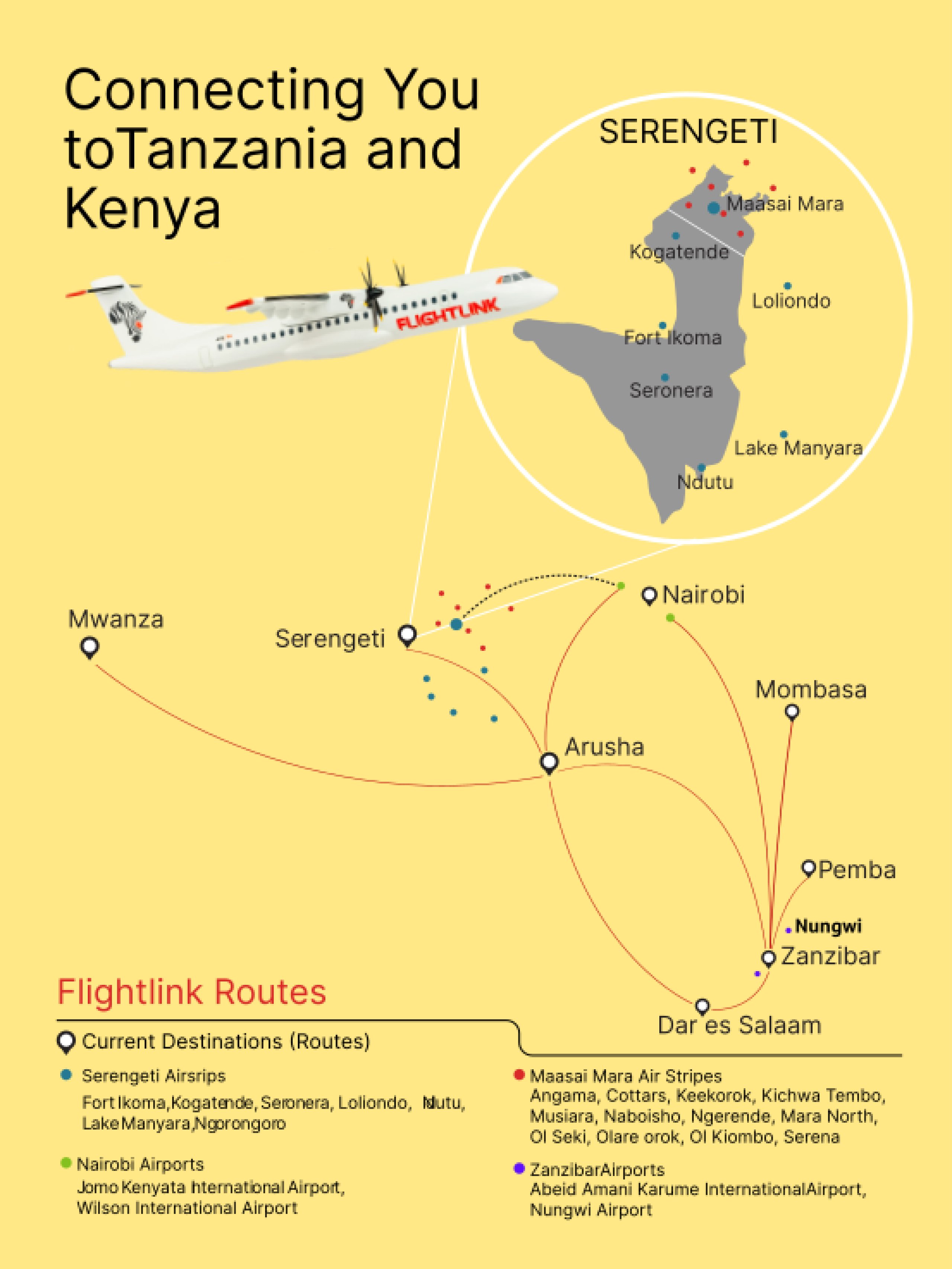 "Flighlink" daugiausia dėmesio skiria pagrindinių Tanzanijos turistinių vietų sujungimui su didžiausiu miestu Dar es Salaamu.