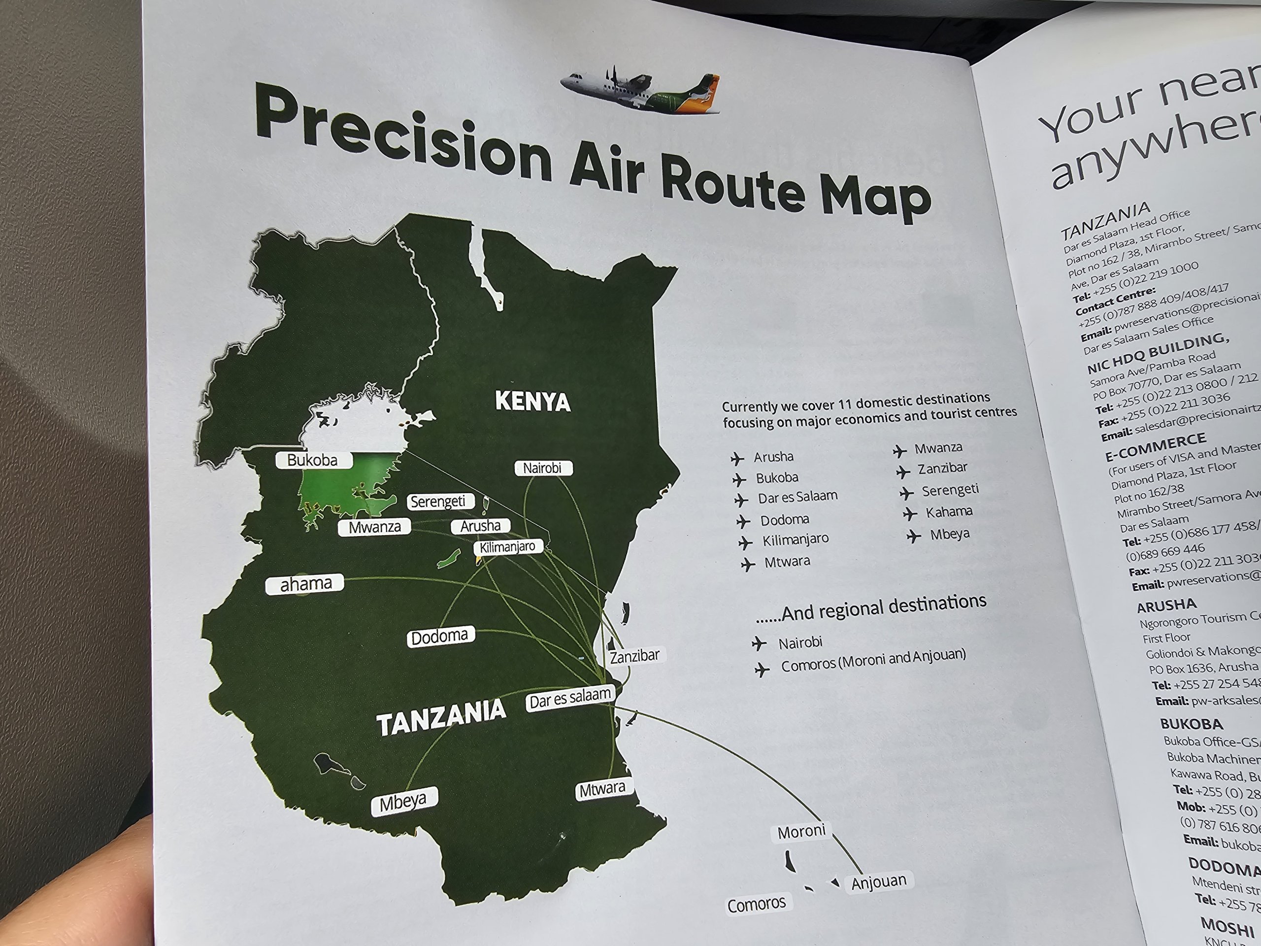 "Precision Air" yra tinklo oro linijų bendrovė, siūlanti jungiamuosius skrydžius per oro uostus Dar es Salaam DAR arba Kilimandžaro JRO arba Zanzibaro ZNZ.