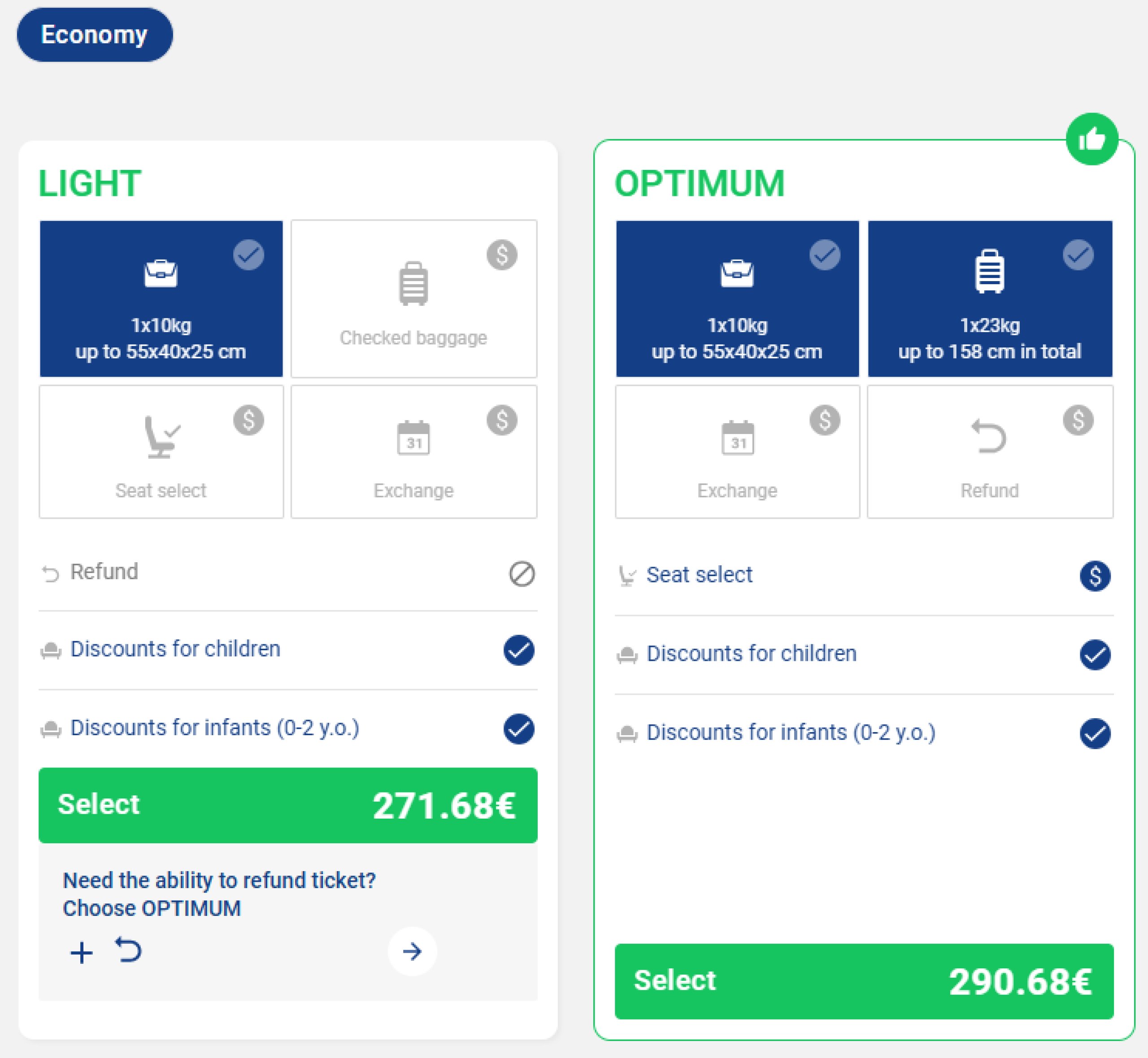 - Optimum - Rankinis bagažas ir registruotas bagažas iki 23 kg, vietos parinkimas už mokestį, keitimas ir atšaukimas leidžiamas už mokestį.