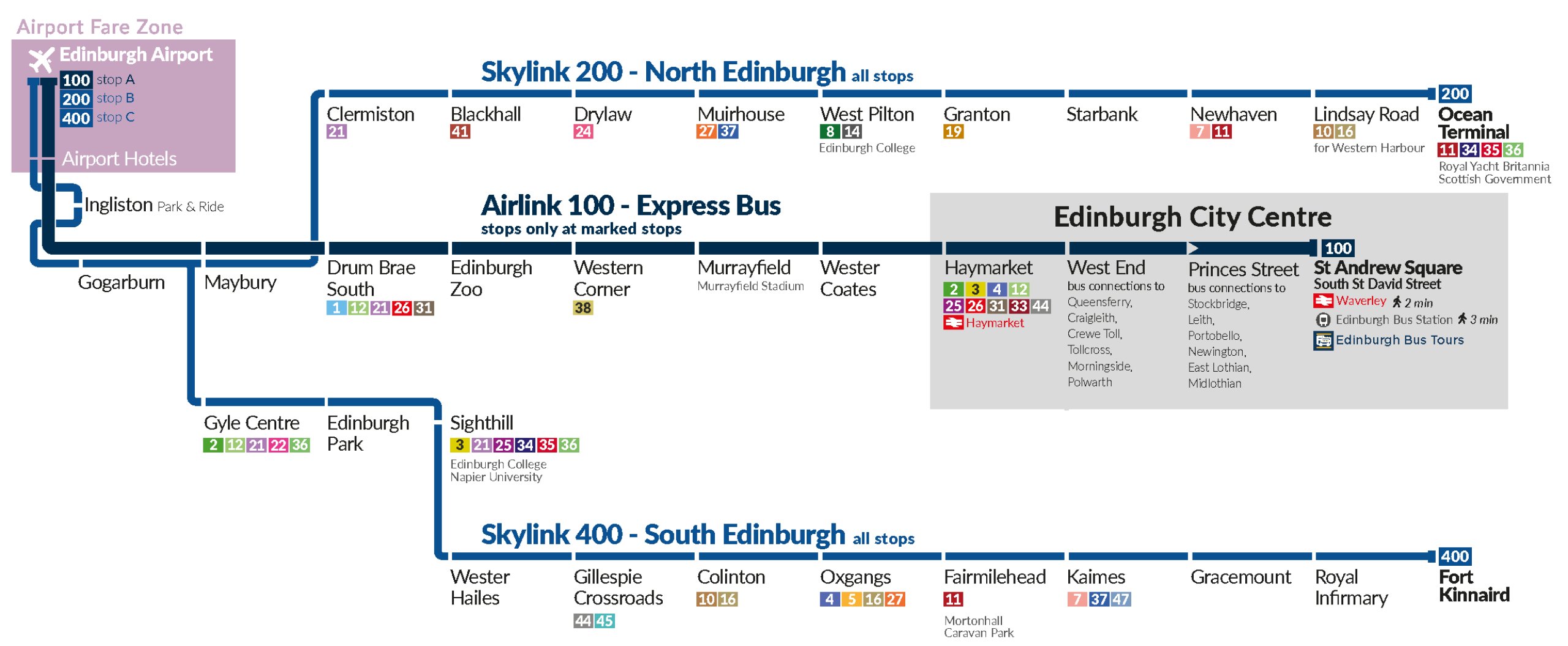 Greičiausias būdas pasiekti centrą - "Airlink" 100 linijos autobusas, kuris važiuoja kas 10 minučių ir pagal tvarkaraštį iki Waverley stoties (St. Andrew Square) važiuoja 22 minutes, tačiau iš tikrųjų gali užtrukti iki 40 minučių, todėl tramvajus yra šiek tiek patikimesnė transporto priemonė.