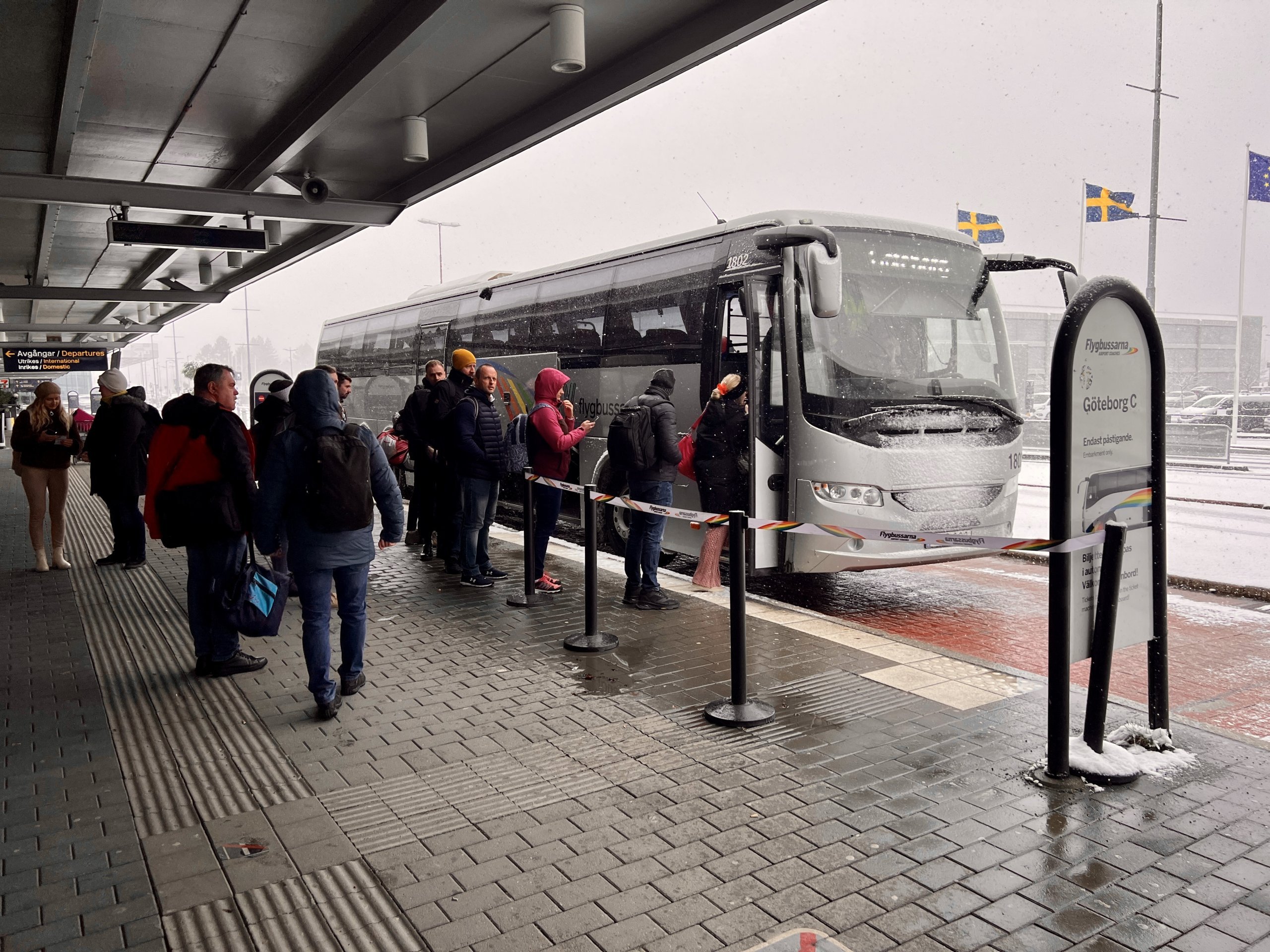 Flixbus išvyksta į oro uostą iki 7 kartų per dieną, o pigiausias bilietas į Geteborgą kainuoja 6,99 Eur. VY Buss išvyksta į oro uostą 5 kartus per dieną, o bilietas kainuoja 101 nok.