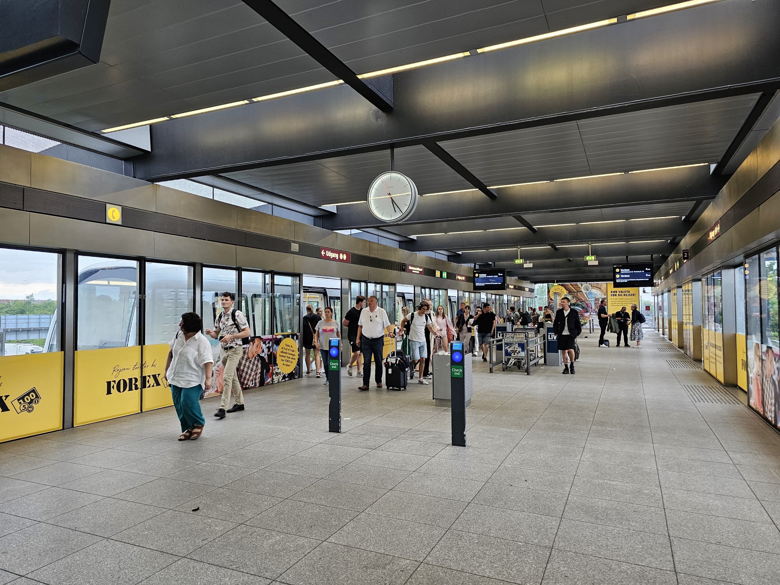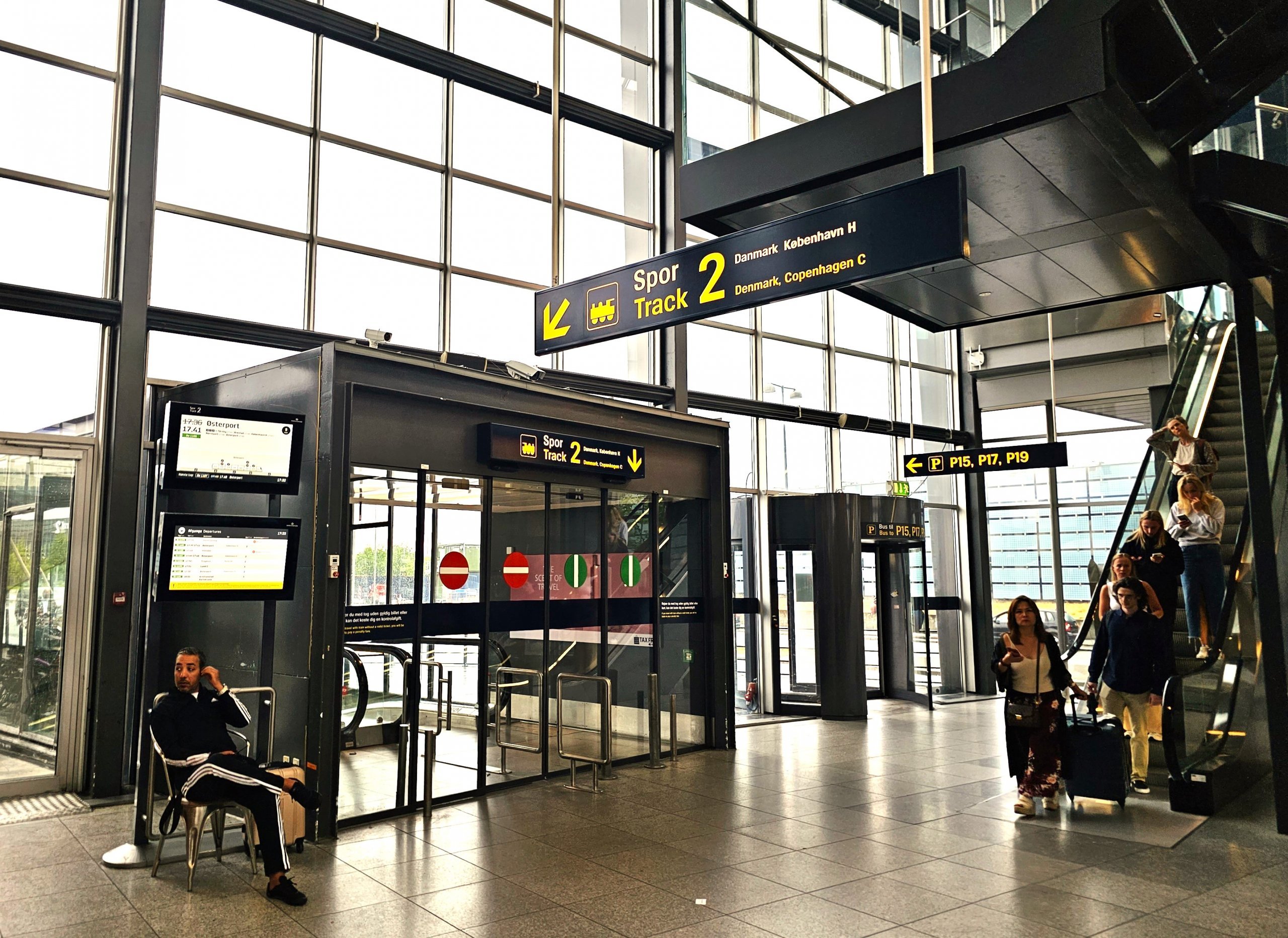 Norėdami nuvykti į Daniją, naudokitės požemine traukinių stotimi atvykimo terminale, 2 bėgių kelias.