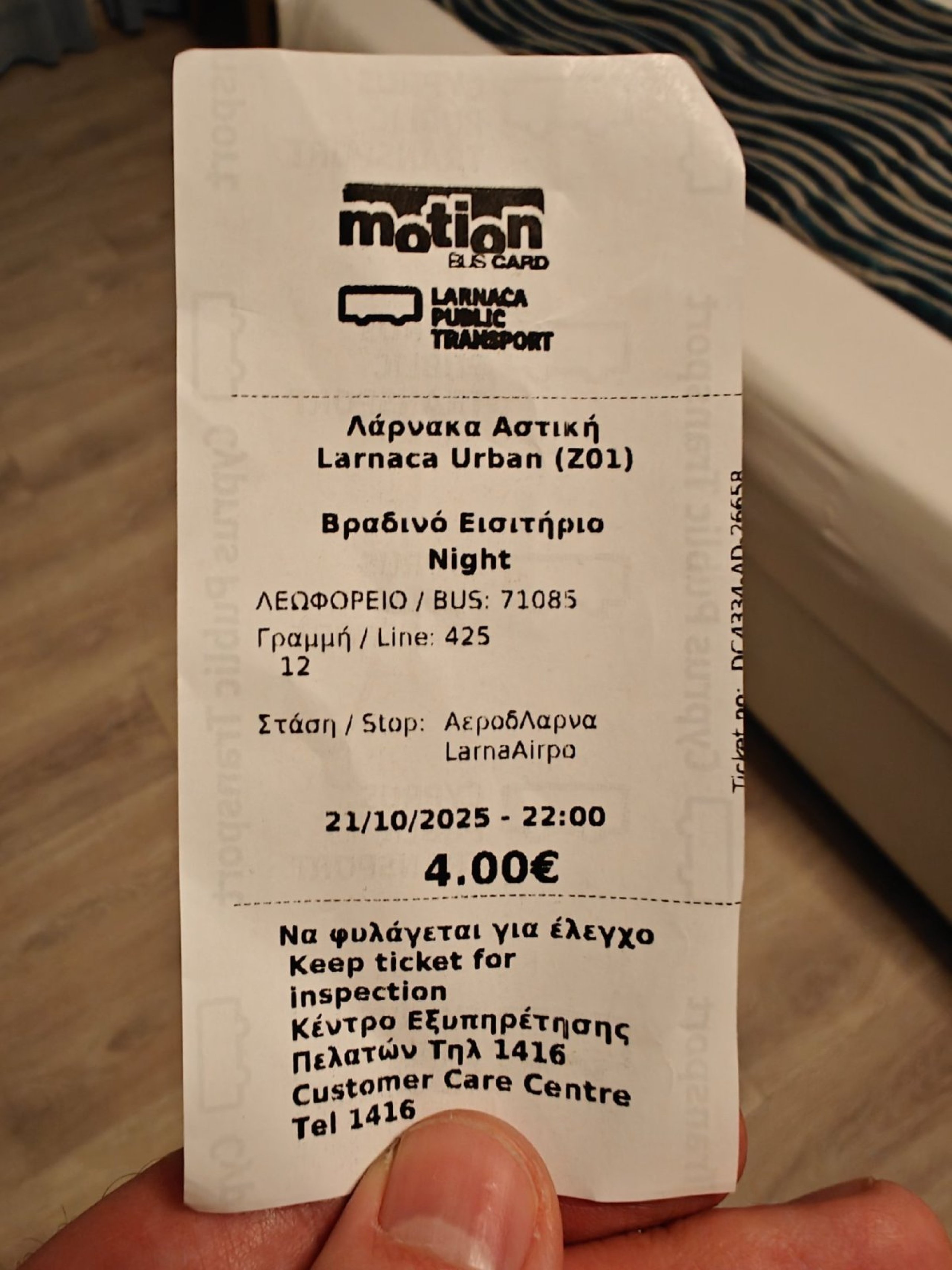 - 15 eur - 2 dienų bilietas Larnakos viešojo transporto linijoms, galioja tik kalendorinėmis dienomis, bet ne 48 val.