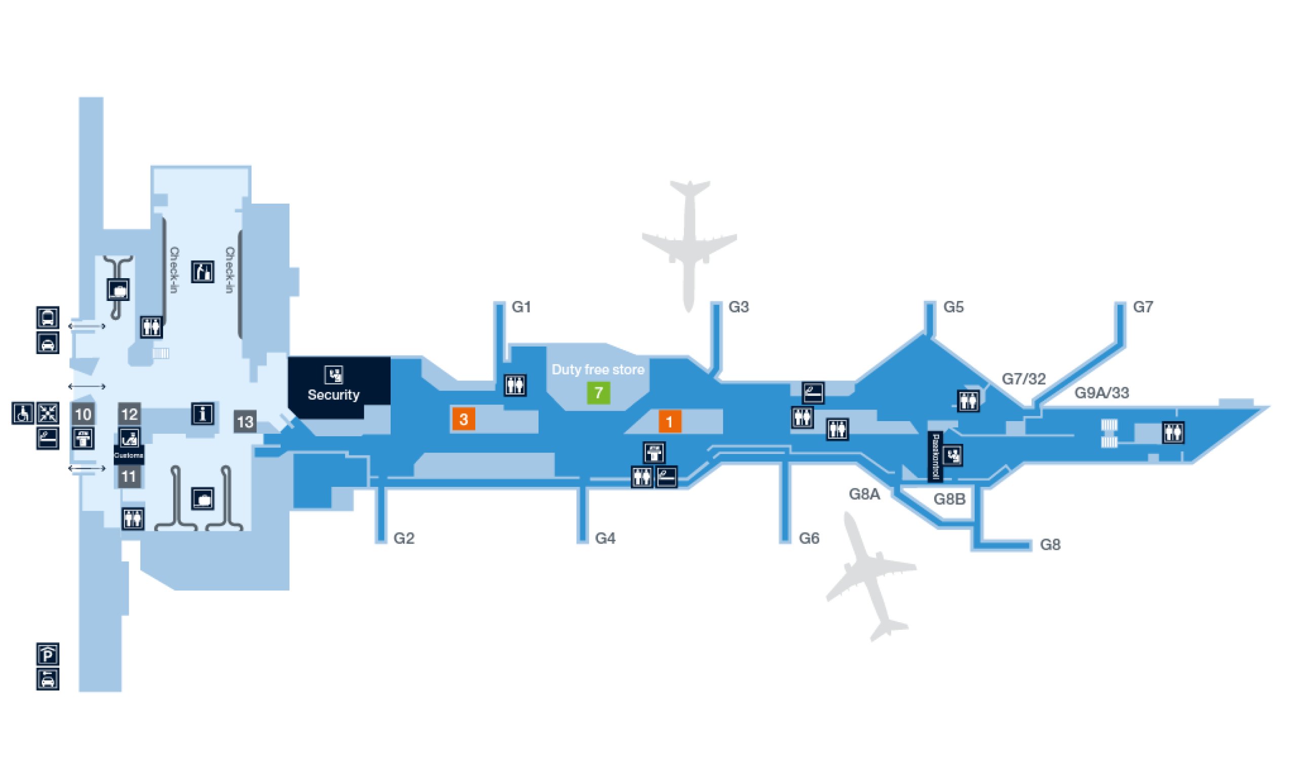 Per vieną saugumo patikrą pateksite į bendrą visų skrydžių tranzito zoną. Tada pačiame terminalo gale yra pasų kontrolė, skirta ne Šengeno zonos skrydžiams, kurie vyksta tik pro išvykimo vartus nuo G7 iki G33.