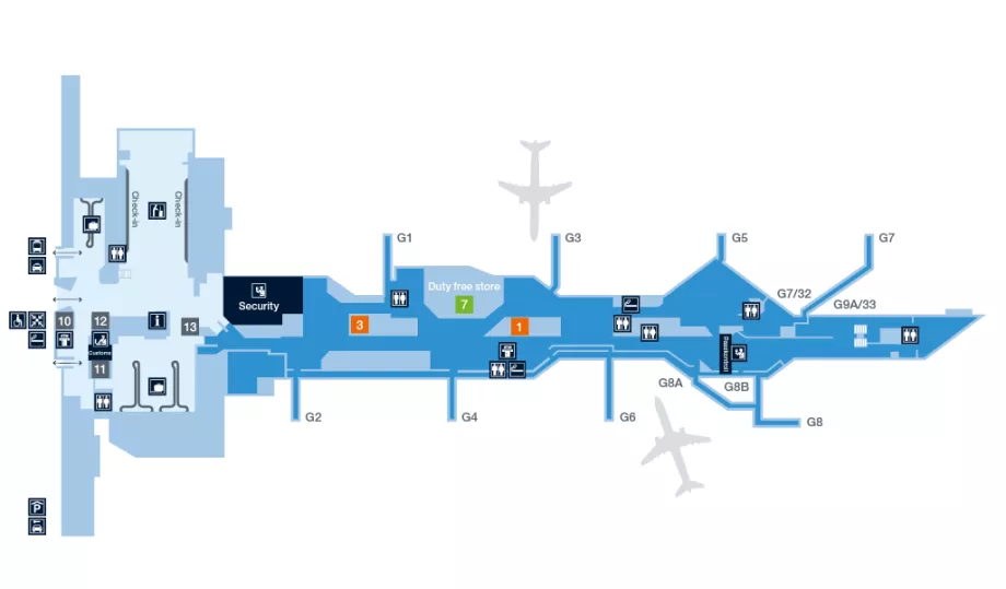 Atsisiunčiamą oro uosto žemėlapį ir išsamius kiekvieno terminalo žemėlapius rasite šiame puslapyje: swedavia.com/malmo.