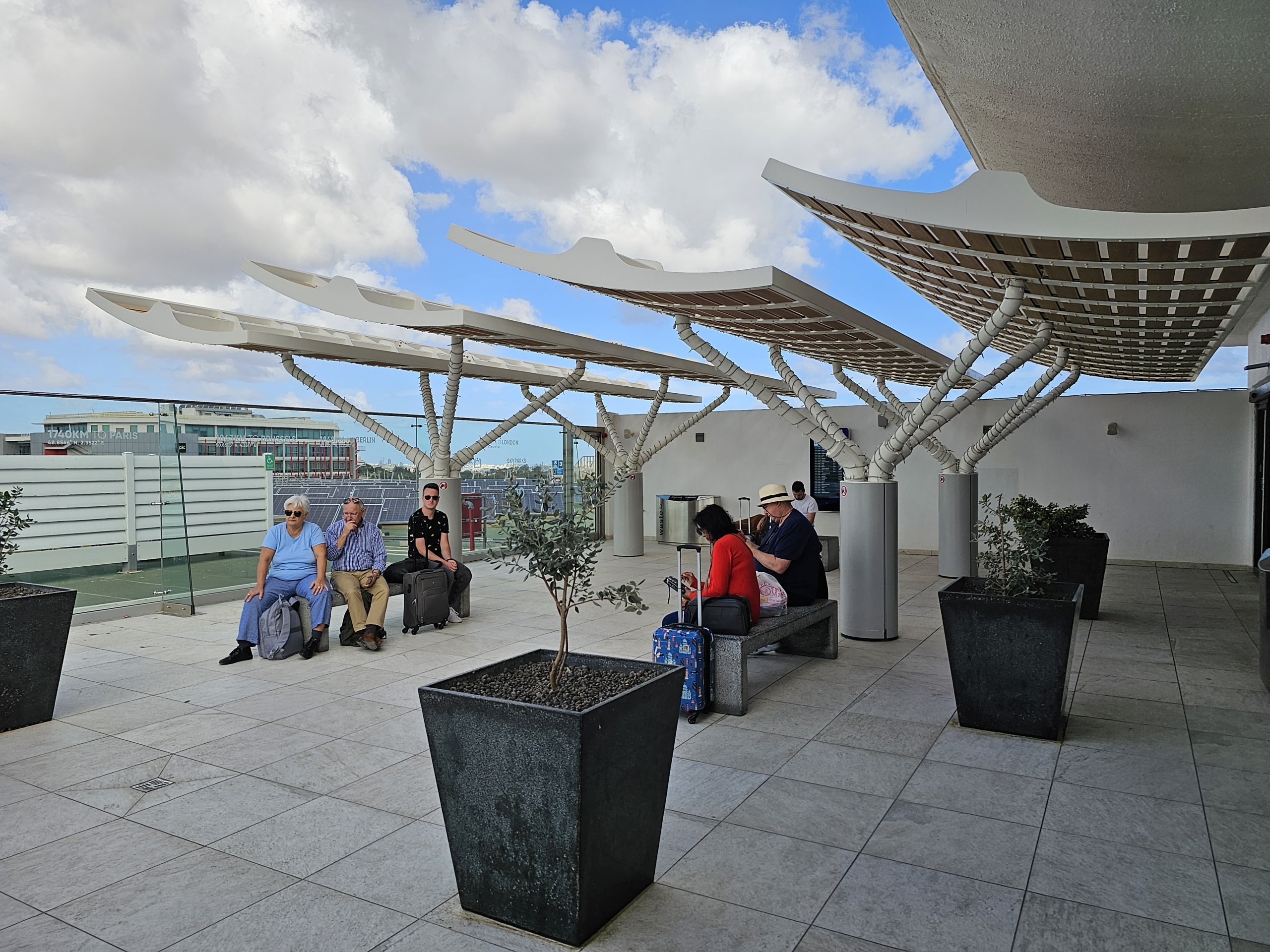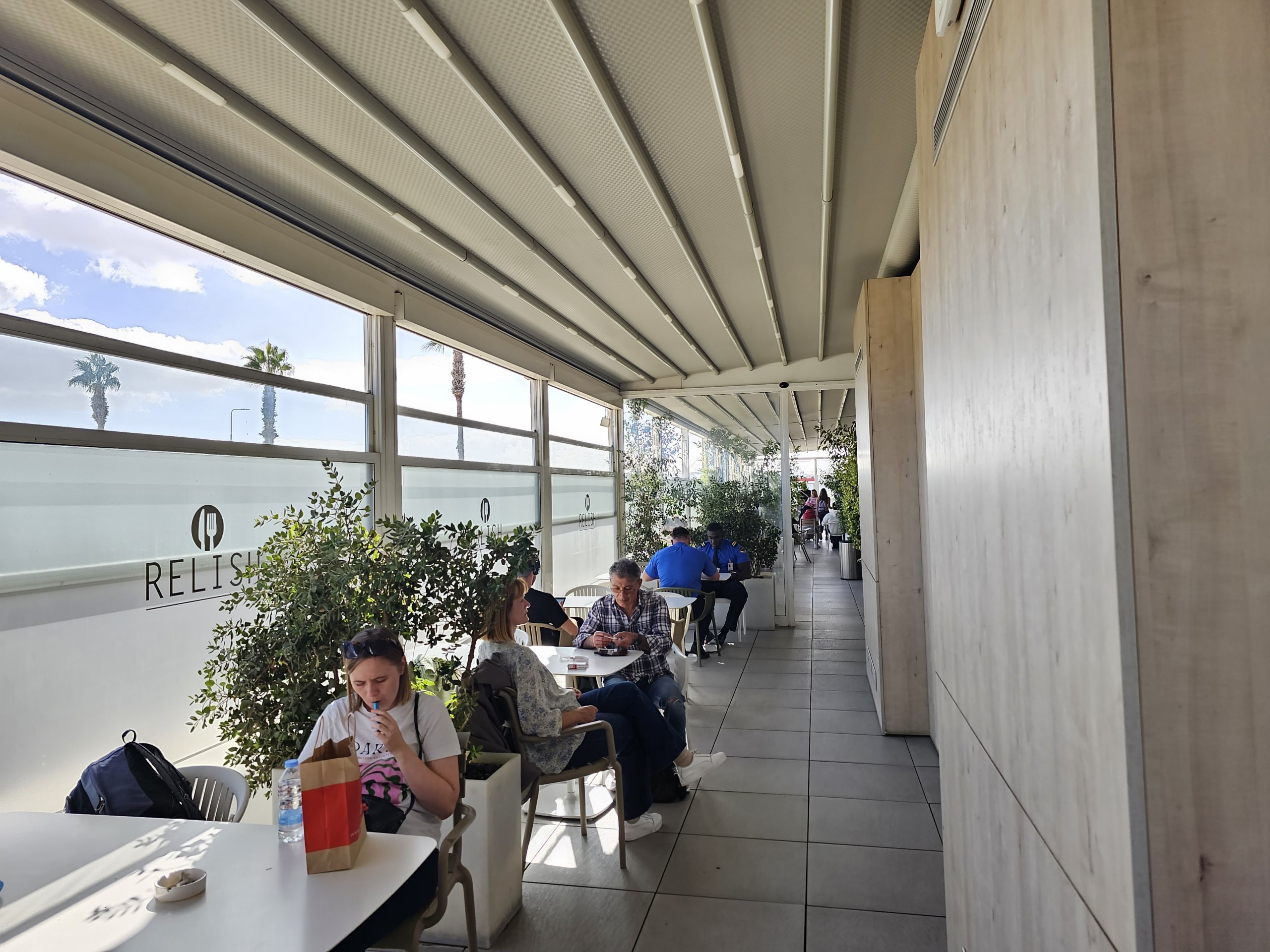 Praėję pro apsaugos postą, galite naudotis iš dalies lauko rūkymo vieta, esančia šalia restorano "Relish".