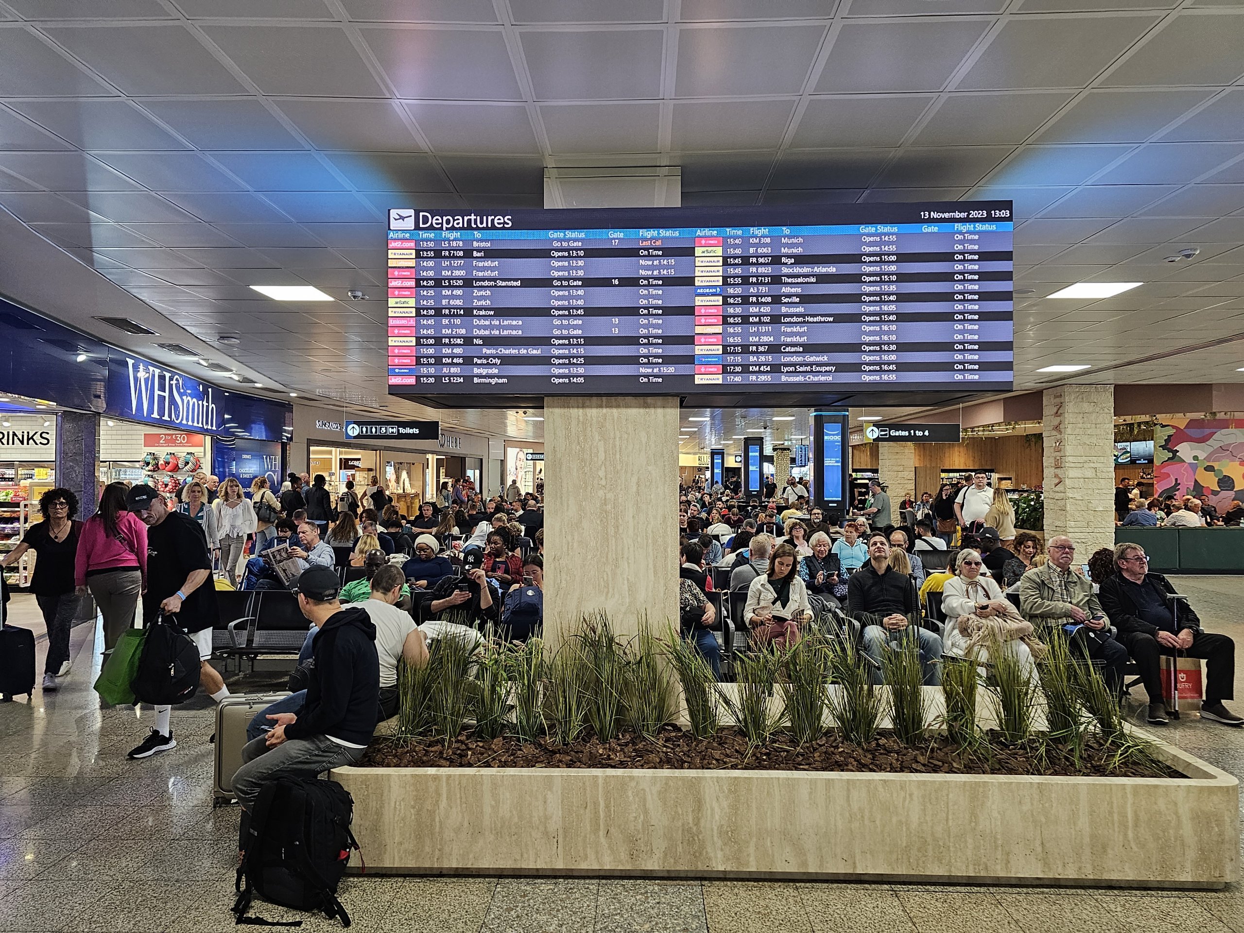 Piko metu, ypač anksti ryte ir apie vidurdienį, oro uostas gali būti labai perpildytas, todėl būkite pasiruošę, kad jame gali trūkti sėdimų vietų, o prie saugumo patikros gali susidaryti iki 30 minučių trukmės eilės.