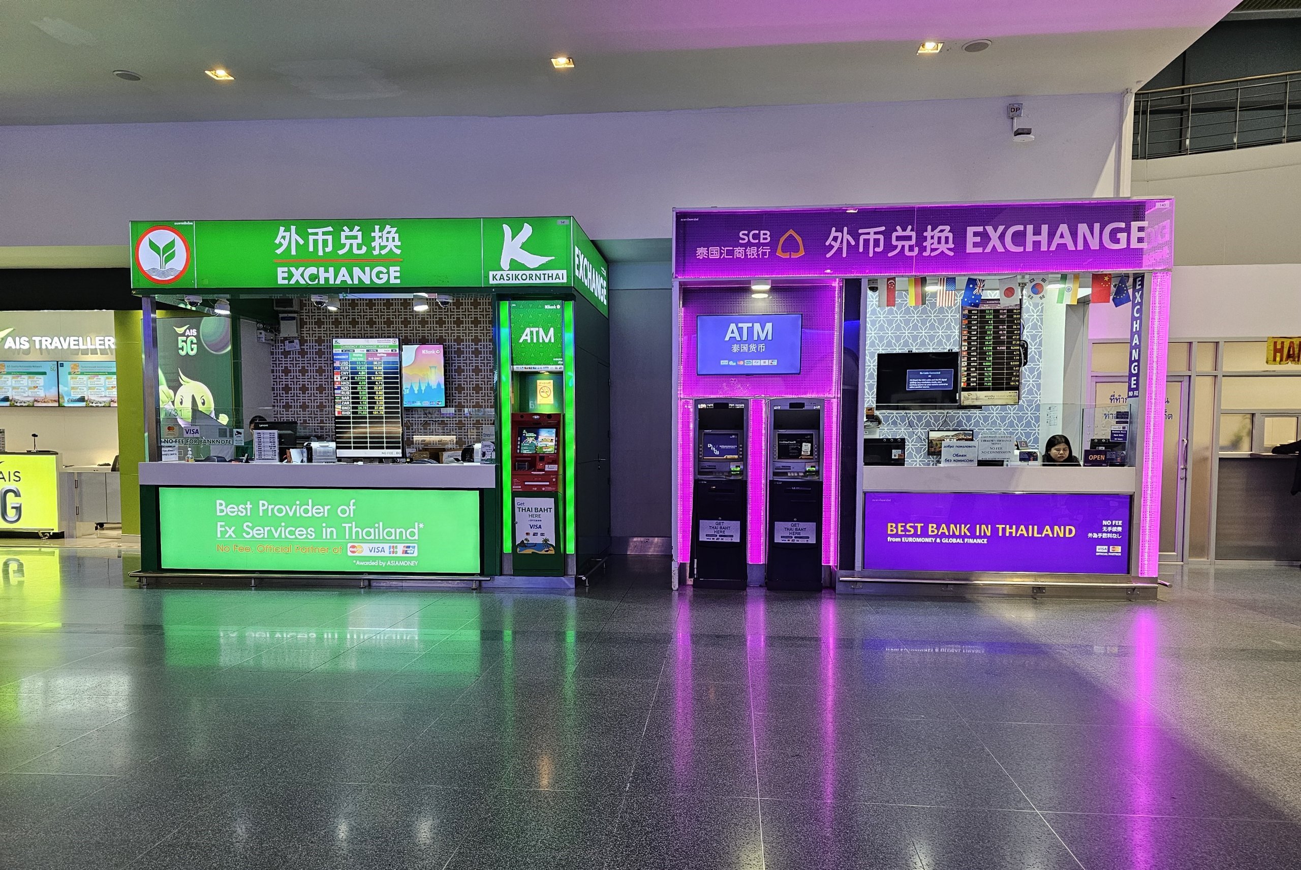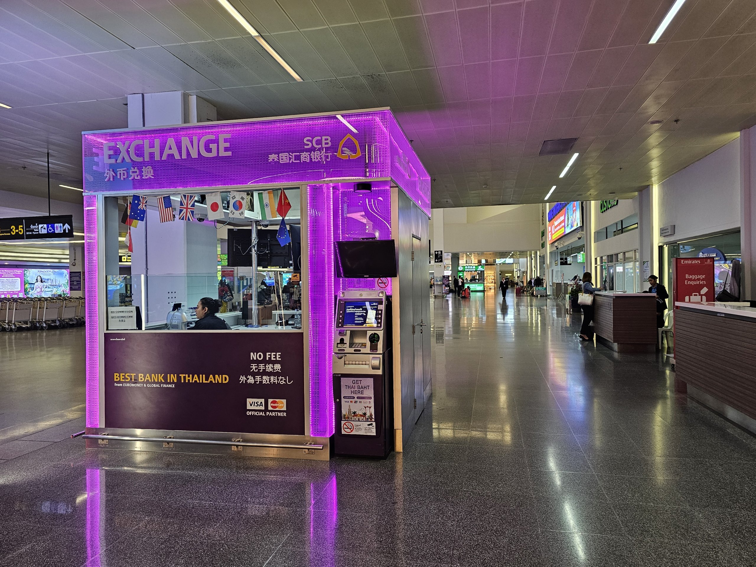 Jei pageidaujate greičiau išsigryninti pinigų, oro uoste yra daug vietinių Tailando bankų bankomatų. Mokestis už pinigų išgryninimą užsienio kortele visada yra 220 tūkst. tbanų. Todėl bankomatais verta naudotis tik norint išsigryninti didesnes sumas.