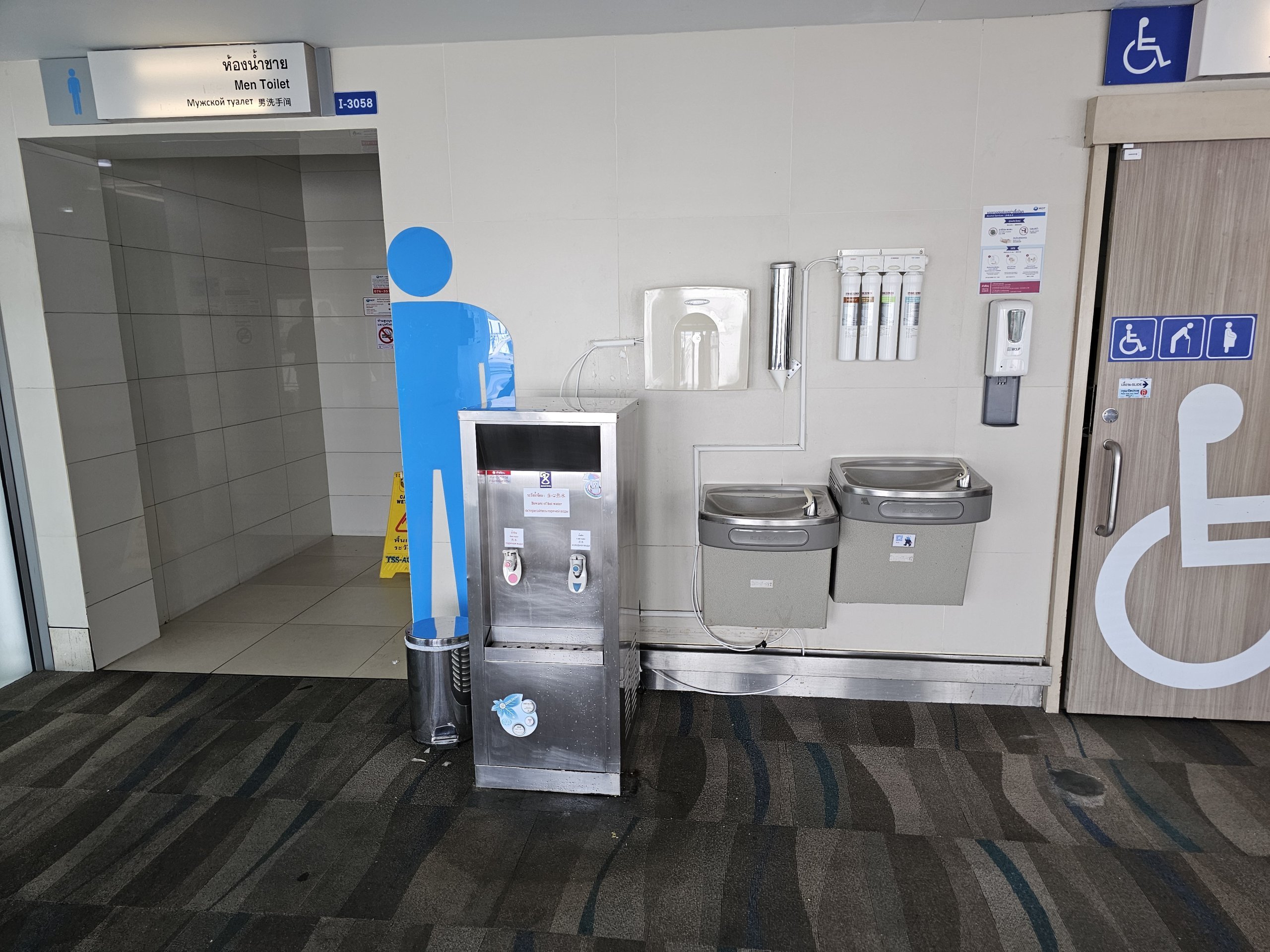Šalto geriamojo vandens fontanėlius, iš kurių taip pat galite įsipilti į savo buteliuką, rasite visuose viešosios zonos tualetuose ir zonoje po saugumo patikros.