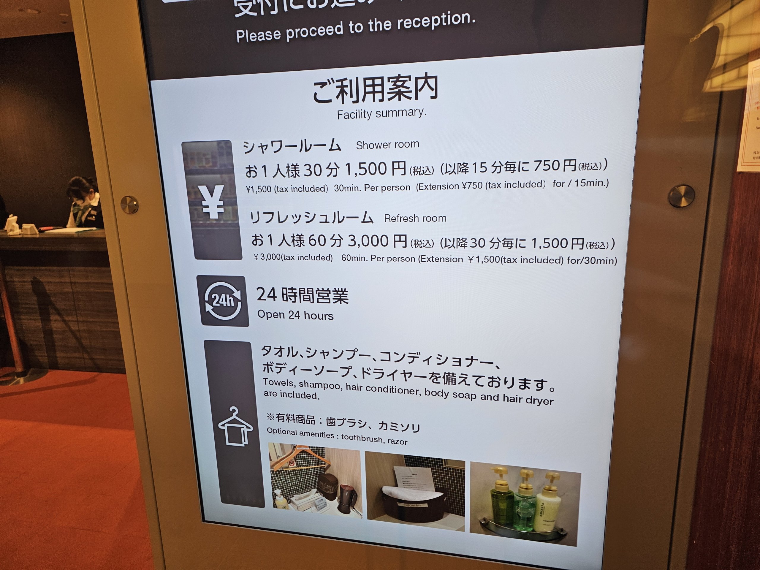 - Dušo kambarys - viešoji erdvė, atvykimo salė 1F, dirba 5:00-10:00/16:00-22:00, 30 minučių dušo mokestis 1 500 jpy