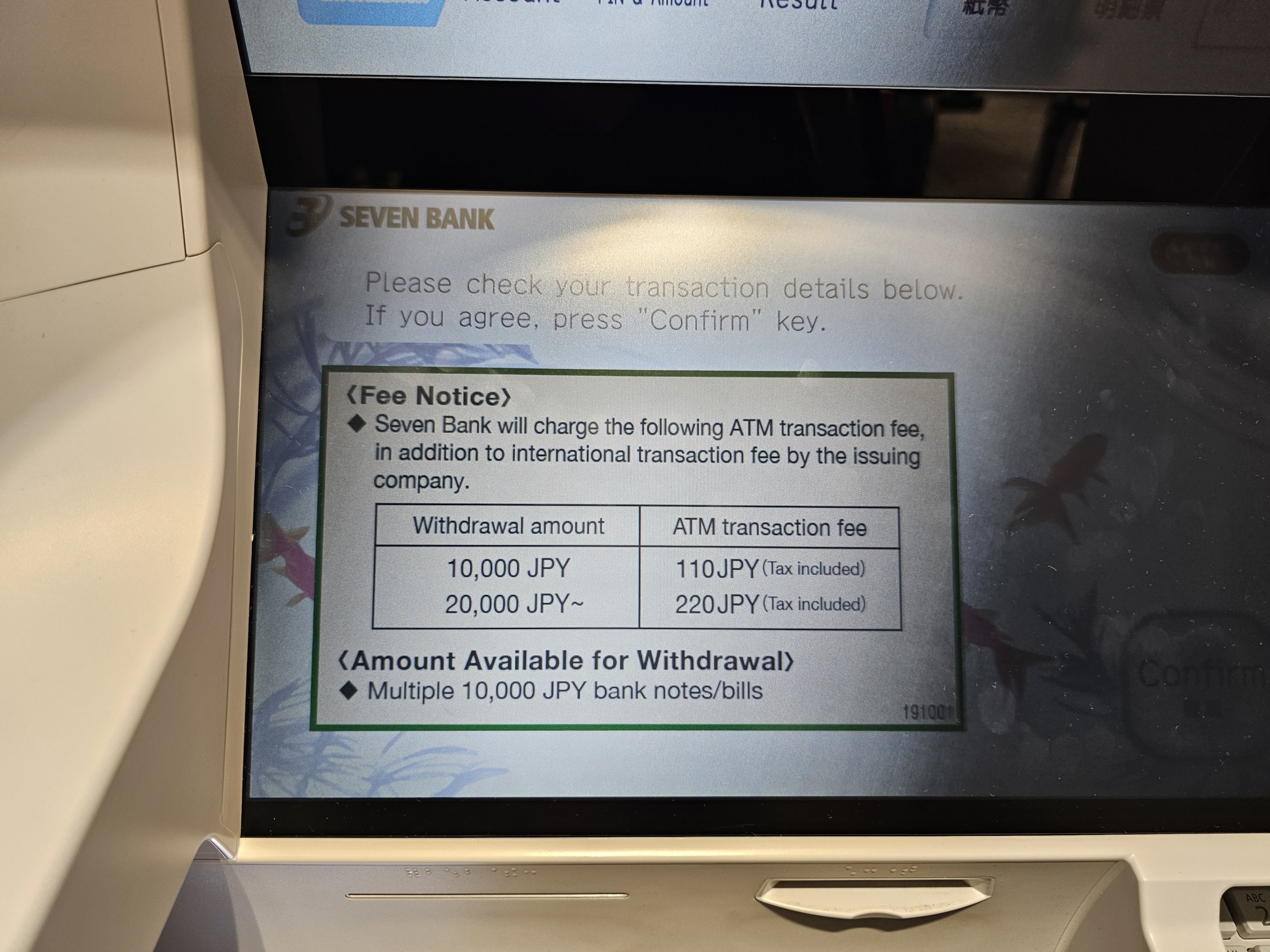 - Išimant iki 10 000 jenų, taikomi vienodi bankomatų mokesčiai: 110 JPY