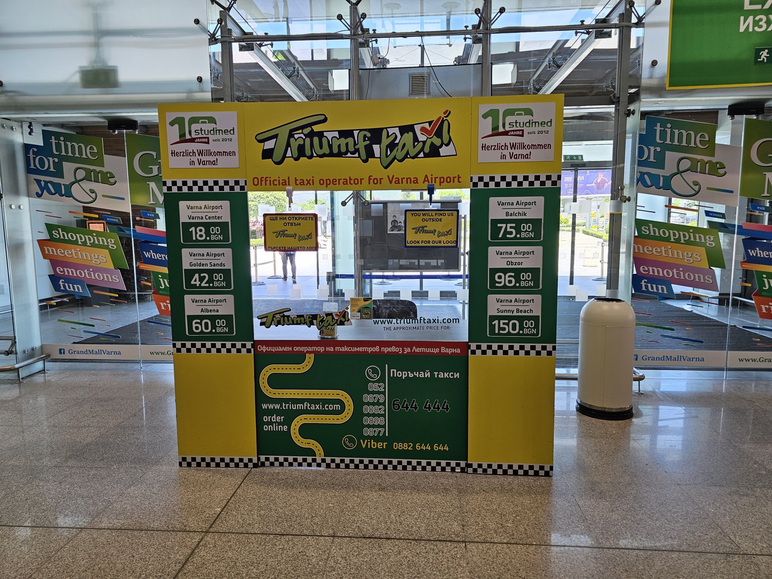 Oficialūs "Triumph" taksi automobiliai yra prie oro uosto pastato bet kuriuo paros metu. Galite užsisakyti kelionę atvykimo salėje esančiame kioske, kur aptarnaujantis darbuotojas jums nemokamai parūpins taksi.