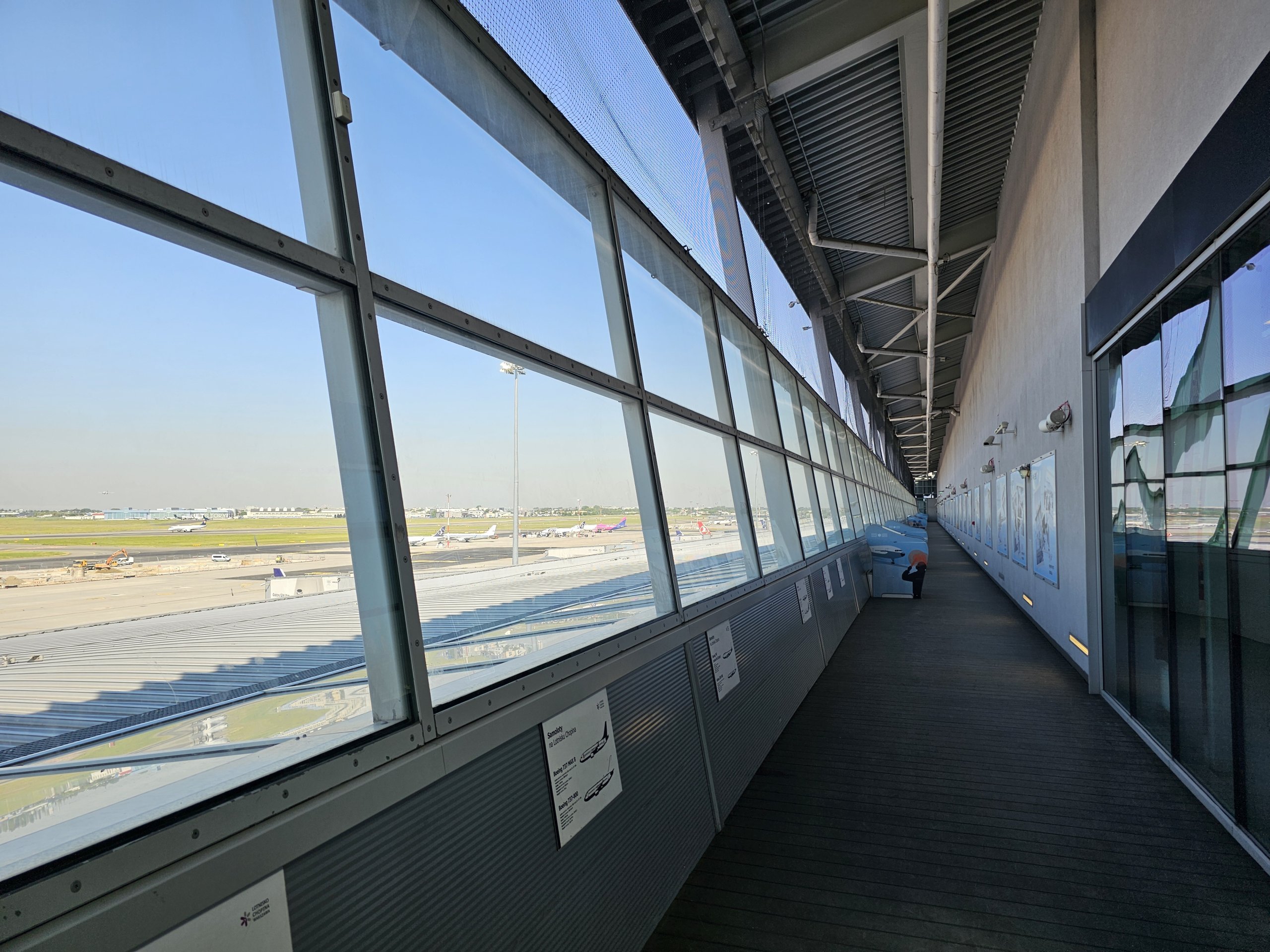 Prieš skrydį skirkite laiko apsilankyti dengtoje apžvalgos aikštelėje, iš kurios matosi asfaltas ir kilimo ir tūpimo takas.