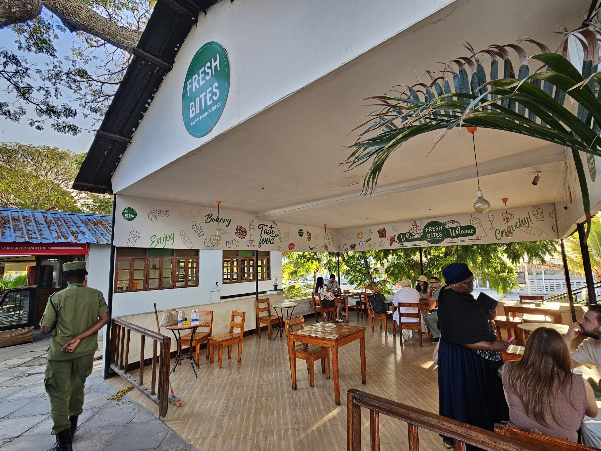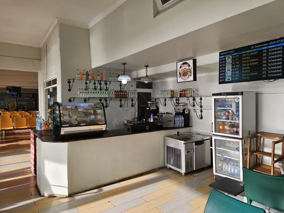 Tarptautiniame terminale po saugumo patikros rasite restoraną, barą ir nedidelį bistro. Kainos čia kelis kartus didesnės nei bet kur kitur Zanzibare.