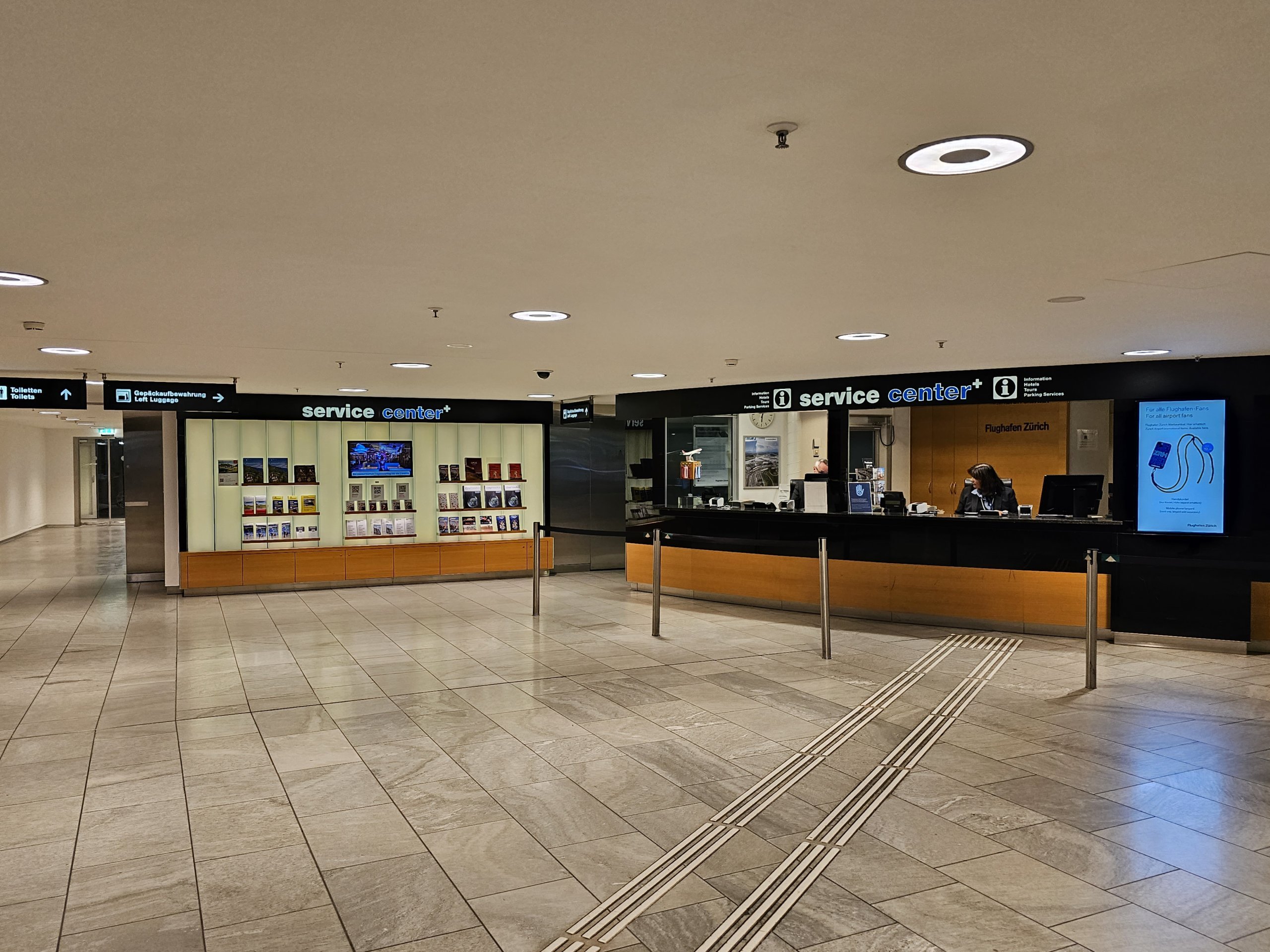 - Service Center - 20 chf, viešoji erdvė, tarp terminalų ir geležinkelio stoties (1 aukštas), dirba 6:00-22:30 val.