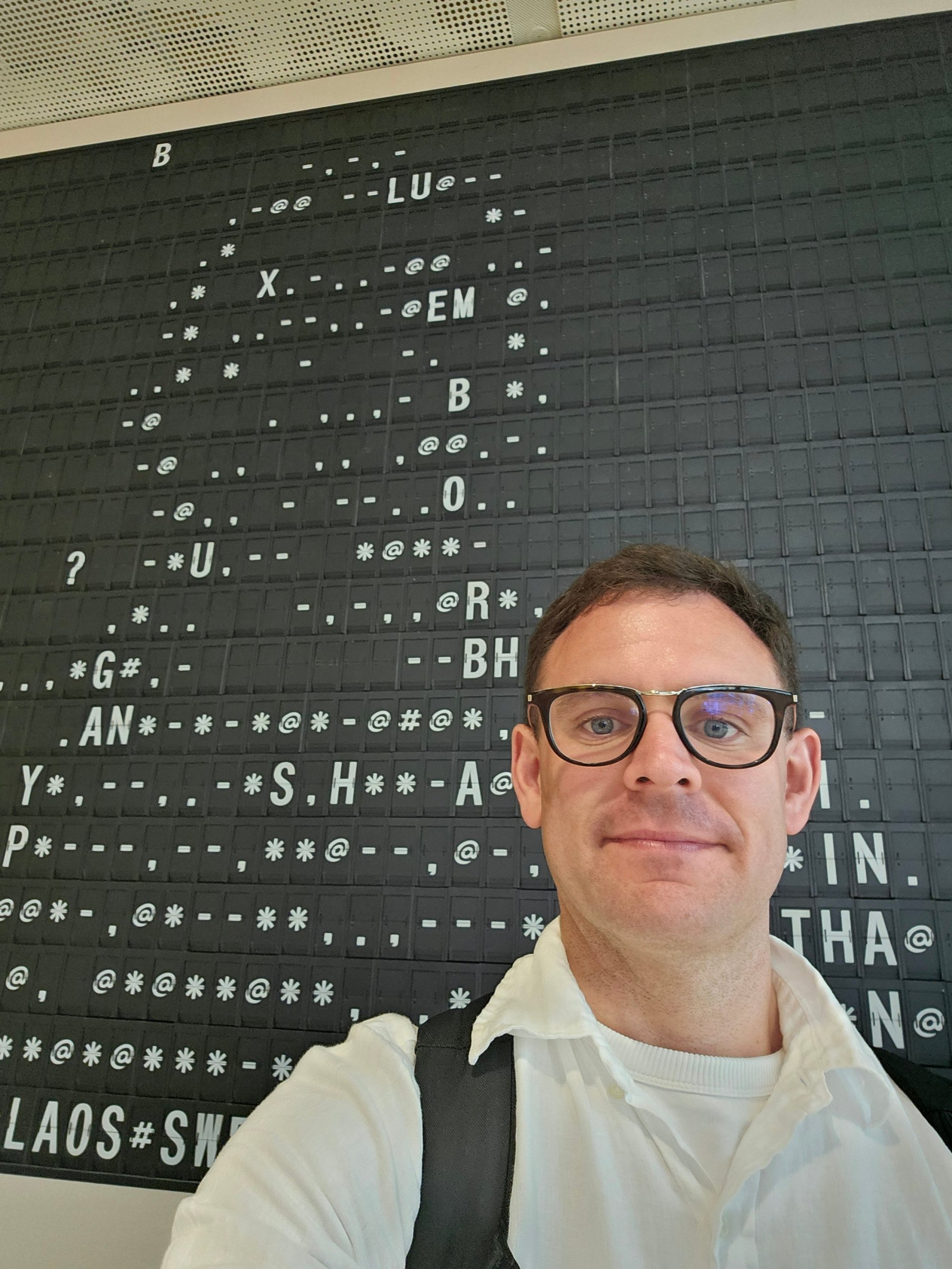 Atsistojate priešais seną išvykimo lentą, o ji, naudodama atšvaitus, sukuria jūsų kontūrą.