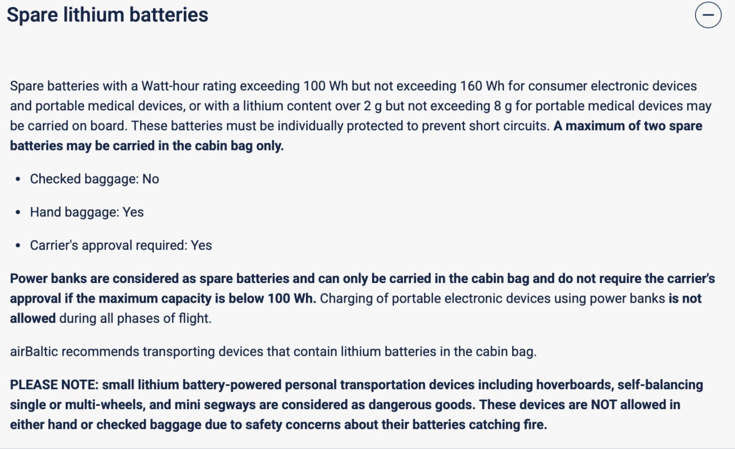 Kai kuriose oro linijose 160 Wh / 43 200 mAh talpos maitinimo banką galima vežtis be apribojimų, o kitose oro linijose turite iš anksto prašyti leidimo vežtis didesnės nei 100 Wh ir mažesnės nei 160 Wh talpos maitinimo banką.