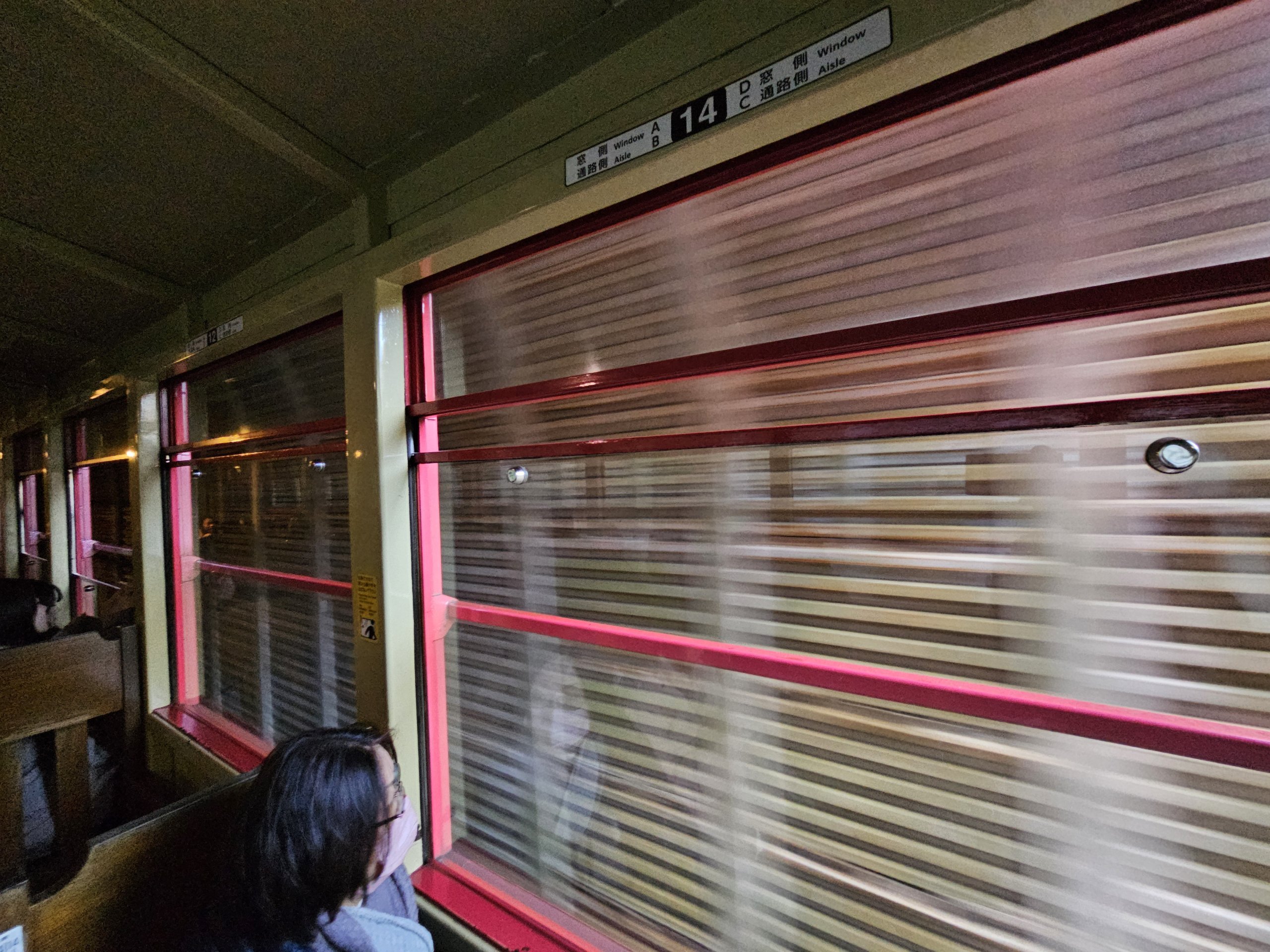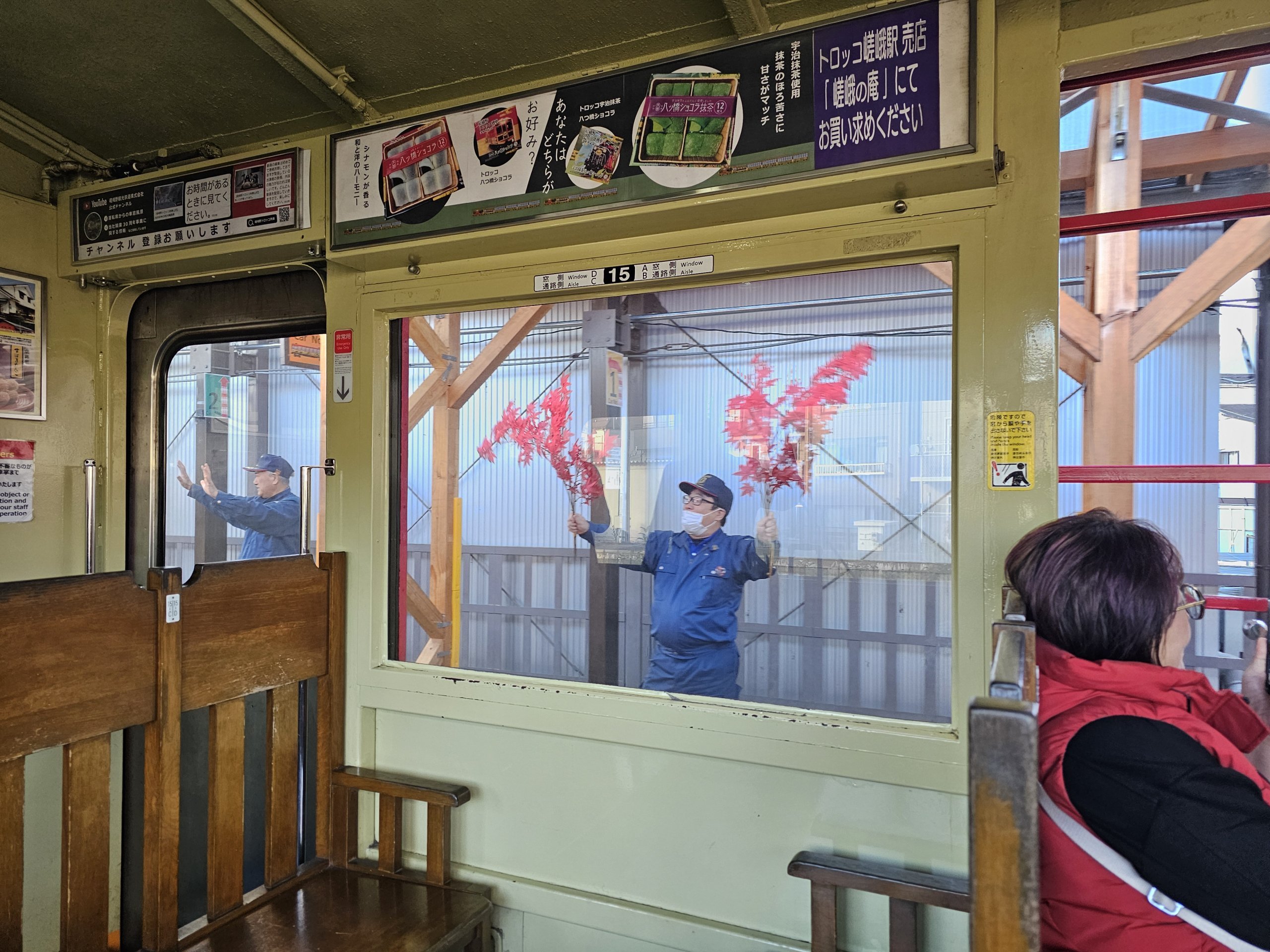 Įlaipinimas gerai organizuotas, o mums išvažiuojant darbuotojai mojuoja šakomis su spalvotais lapais. Tai šiek tiek infantiliška, bet kadangi traukinyje daug vaikų, tai taip pat labai gražu.