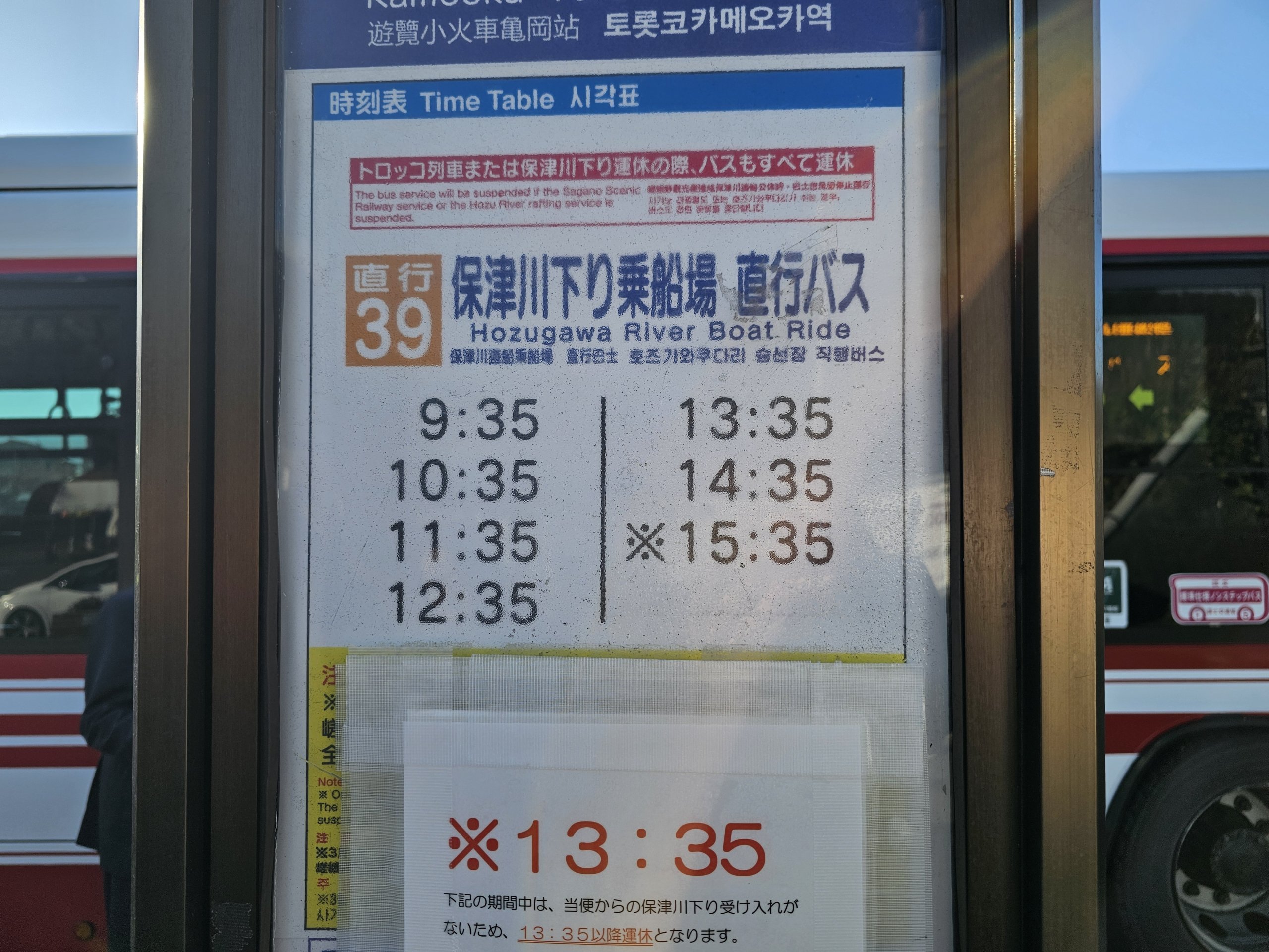 Nuo romantiškojo Sagano traukinio tiesiai į prieplauką važiuoja 39 autobuso linija, kuri jungiasi su kiekvienu traukiniu, o jos kelionė trunka apie 10 minučių. Už autobuso bilietą galima mokėti grynaisiais pinigais arba transporto kortele (ICOCA, Suica ar kita).