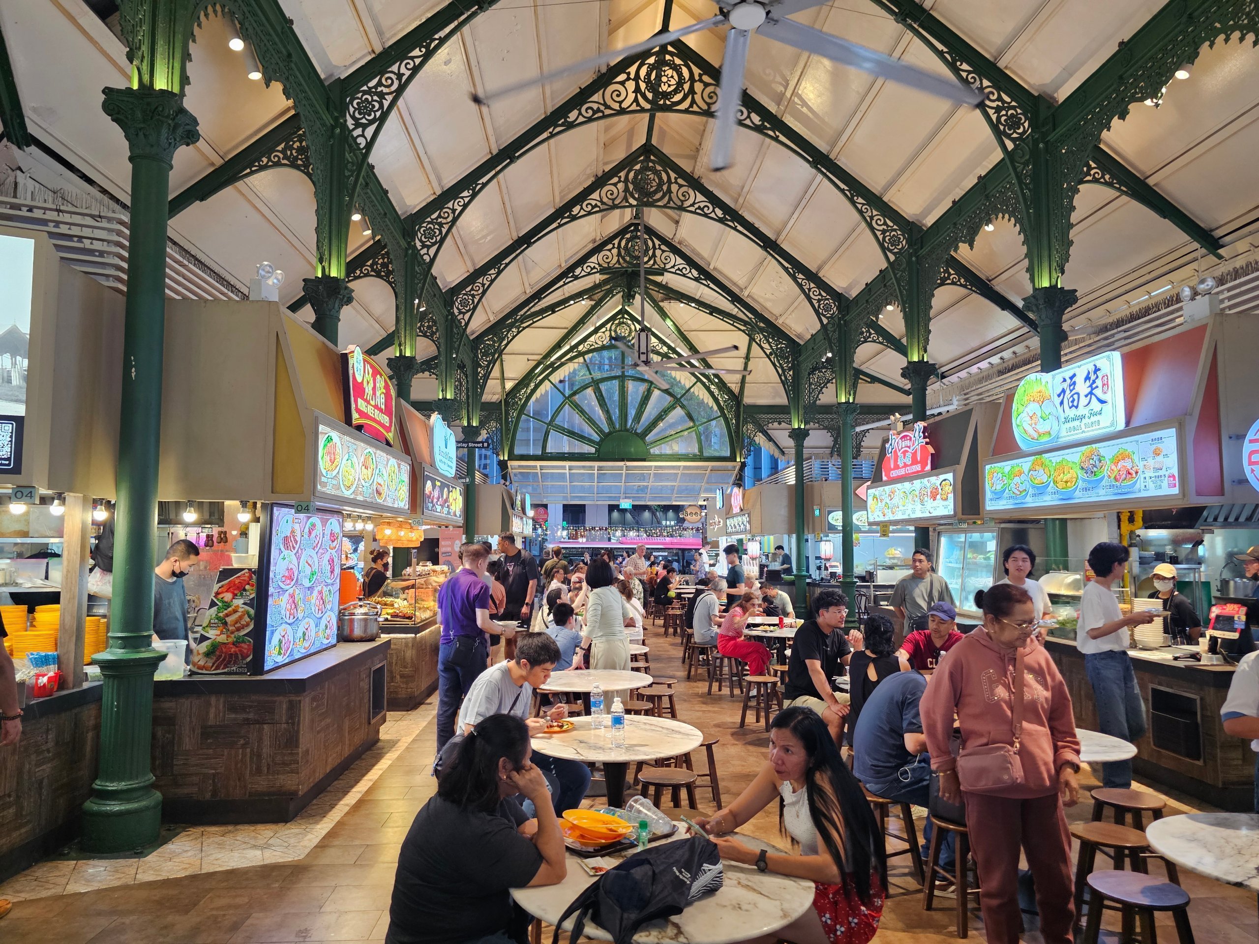 - maistas hawker centre (pvz., Lau Pa Sat, esančiame netoli pėsčiomis)