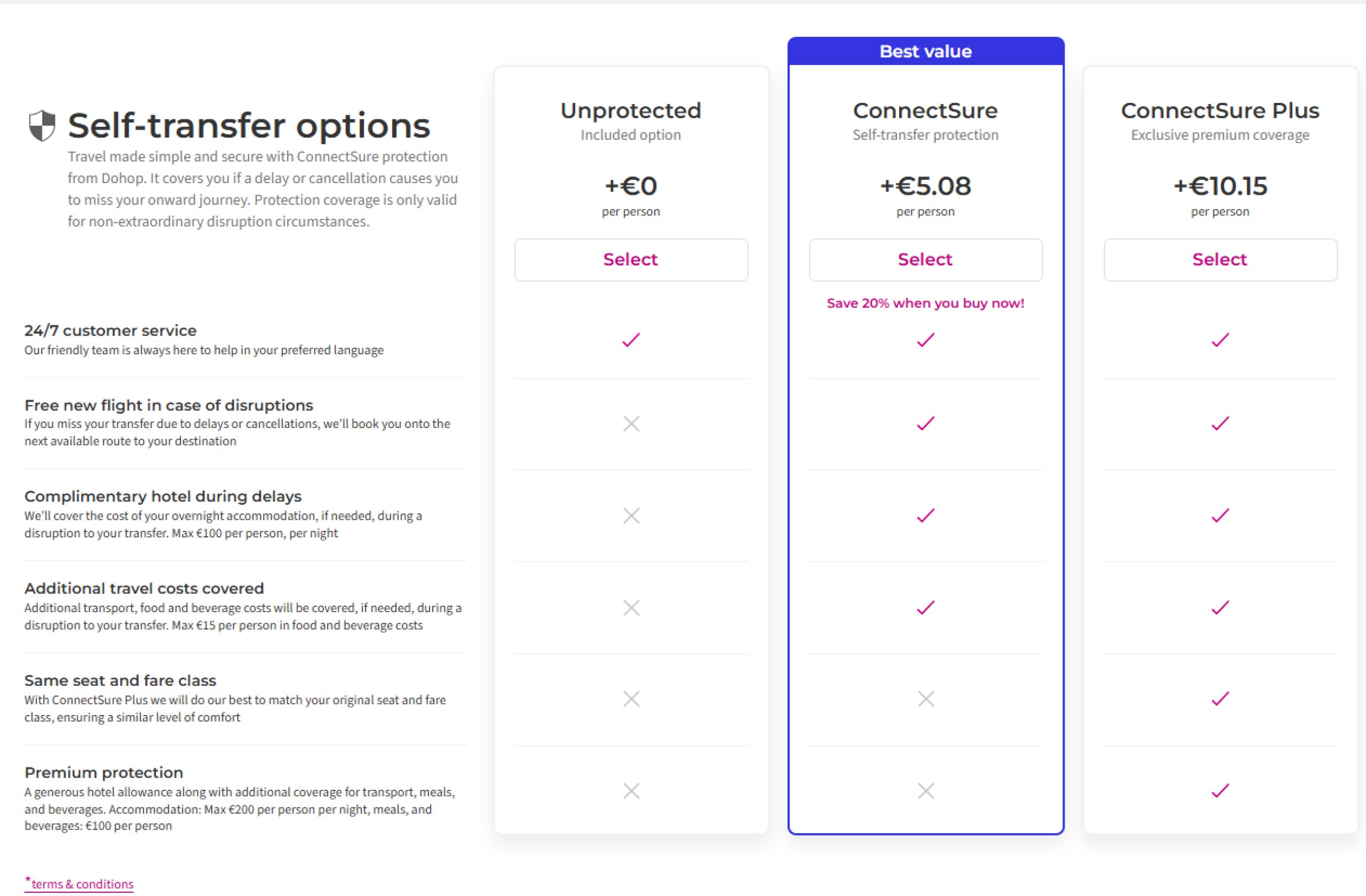 Jei norite turėti garantuotą jungiamąjį skrydį, kartu su bilietais turite įsigyti ir "ConnectSure", kuri pasirenkama skrydžio užsakymo metu.